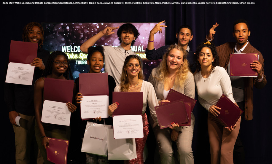 The 5th annual Stay Woke Speech and Debate Competition was an astonishing success – boasting its first ever in-studio audience since the pandemic shutdown of 2020! It was held on November 17, 2022 in the David Brinkley Studio at Barry University and streamed live via YouTube on BTV Channel 14, a TV studio run by Barry students.